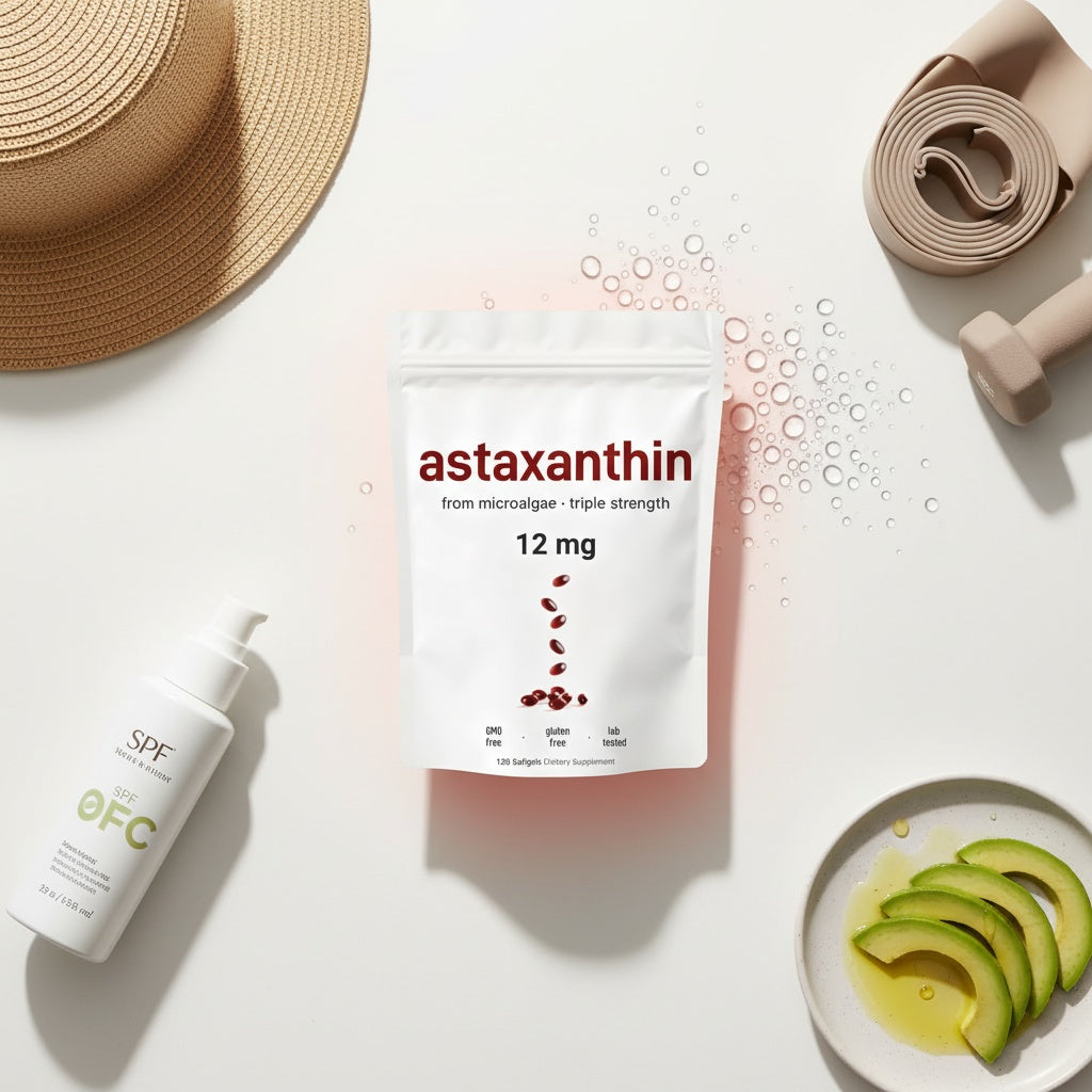 No supplement fixes loose skin. Astaxanthin helps defend against photo/oxidative stress and supports the look of moisture/elasticity over time. Keep doing the big levers: SPF, protein, and resistance training.